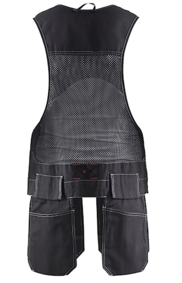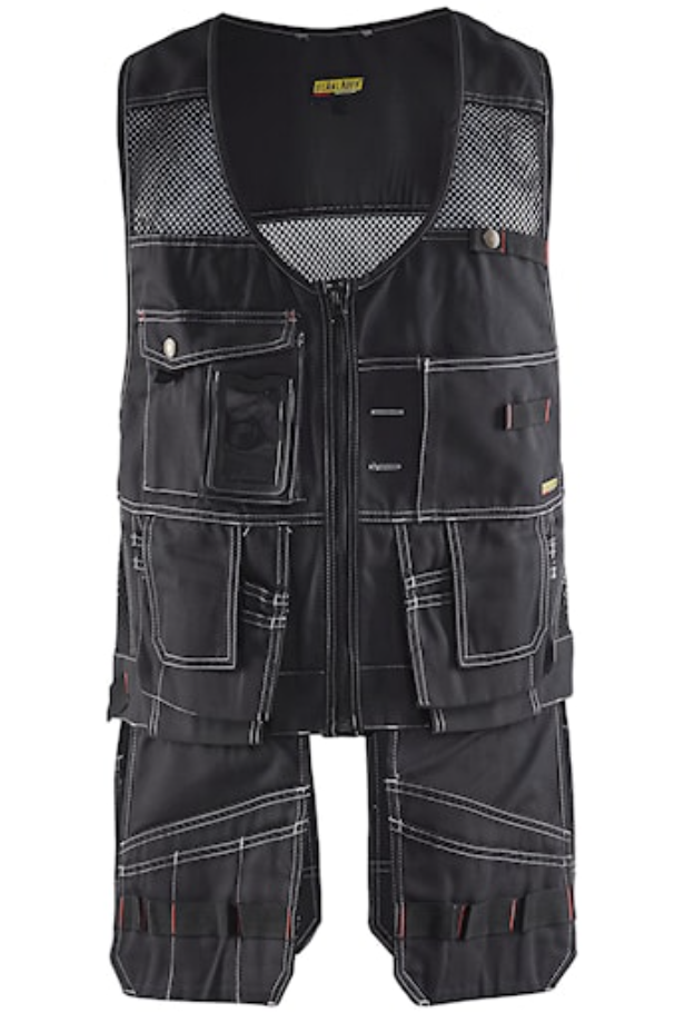 Fordel vægten på overkroppen med en slidstærk vest i polyester og bomuld eller i ren bomuld. Vesten har to brystlommer, en med lås og telefonlomme og en med blyantlomme. To forstærkede sømlommer og to mejsellommer med lås.