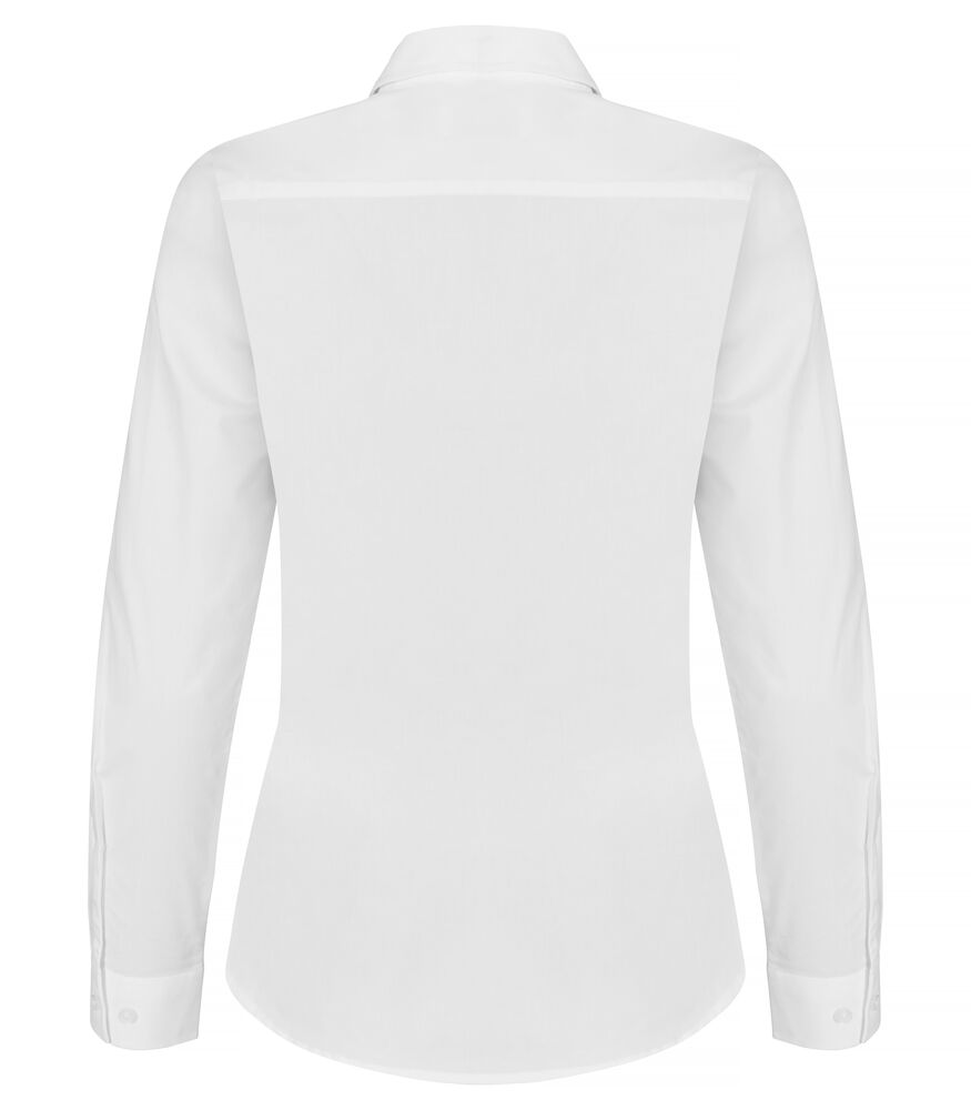 En langærmet skjorte i strækbart materiale med knapper og i normal pasform. Knapjustering ved ærmet, herremodellen har en brystlomme. Bærestykke bagpå.