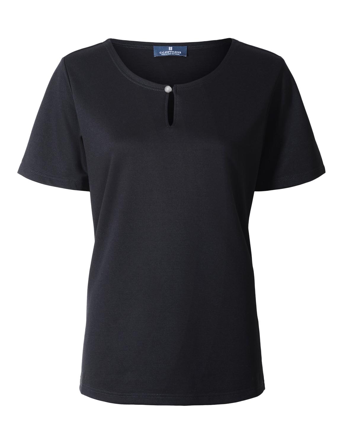 En meget feminin og flatterende T-shirt, med en dekorativ perleknap.