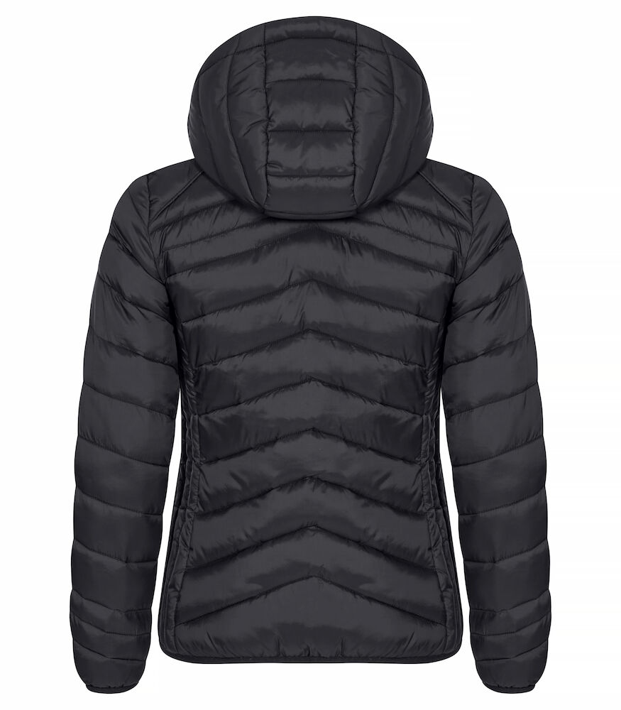 En varm og let jakke med dunlignende polstring. Fremstillet af 100% recycled polyamid. 3 udvendige lommer med lynlås og 2 inderlommer. Elastisk tape for neden og i ærmeender. Damemodel er med aftagelig hætte. Kommer med farvet strop, høretelefonløsning og lynlåsskyde