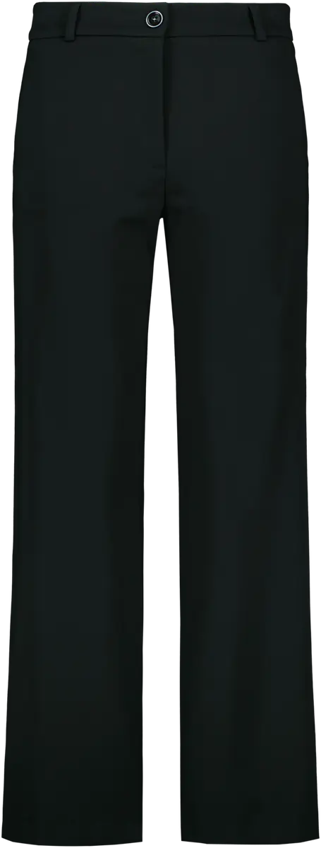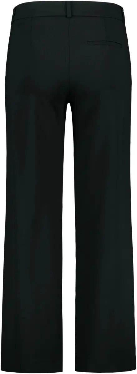 Klassiske bukser med vide ben og skrå forlommer. Bukserne har bæltestropper og en falsk paspoleret baglomme til højre. Benlængden er 78 cm. Fremstillet i EU.