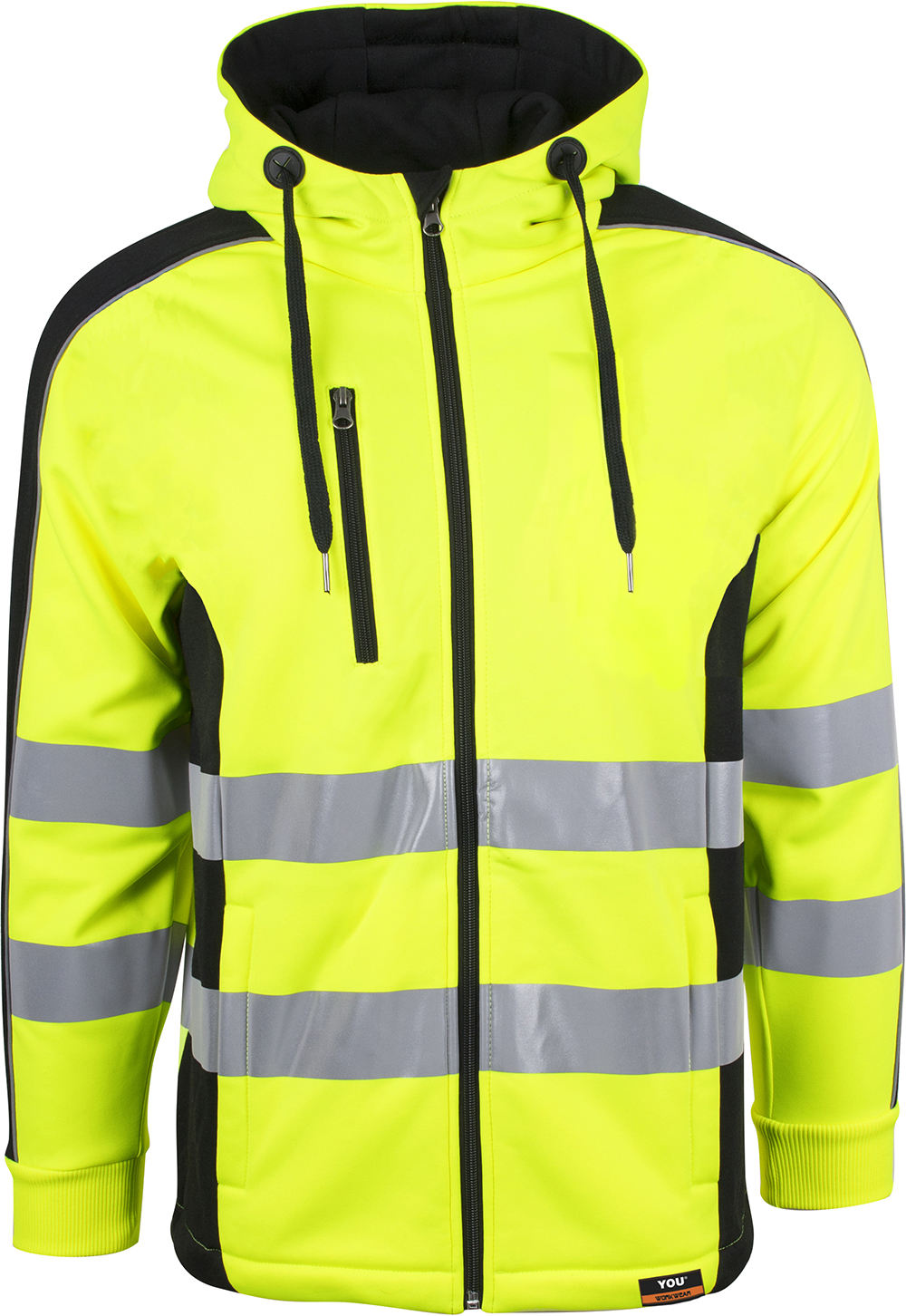 2-farvet unisex hættejakke med kontrastfelt i siden, ærmer og hætte. Påsyede elastiske reflekser om livet og skuldre. Reflekspiping langs ærmer. lynlåslommer i front og brystlomme med lynlås. Multimediaport i lomme. CE-mærket EN 20471, klasse 3.