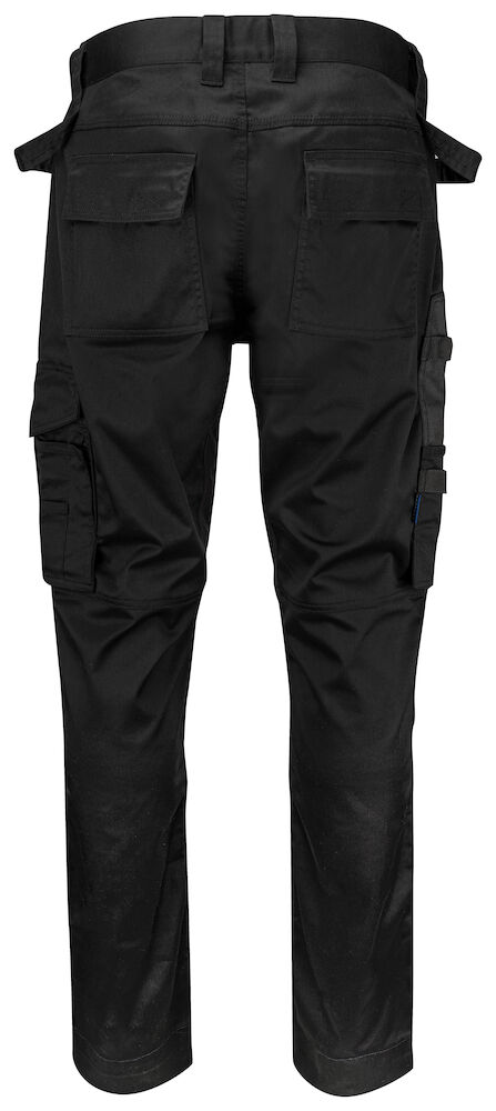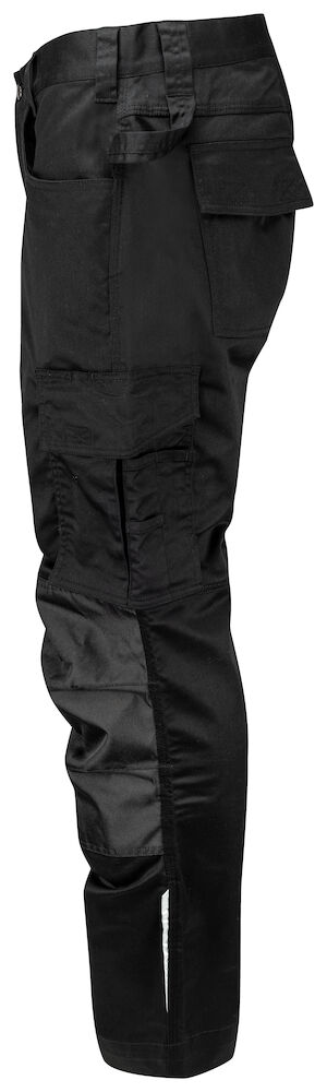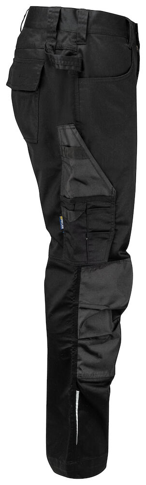 Bukser i strækstof for stor fleksibilitet. 4-vejs strækpanel i skridtet for øget komfort. Sidelommer. Baglommer med klap og velcrolukning. Lommestoklomme og lomme til værktøj med knap til kniv. To hammerstropper, en på hver side. Reflekterende bånd på ydersiden af benene. Forbøjede knæ med indvendige lommer til knæbeskyttere, justerbare i to højdeniveauer. Forstærkninger i lommestoklommen og over knæene for øget holdbarhed. Størrelse C42-C64 kan forlænges med 5 cm.