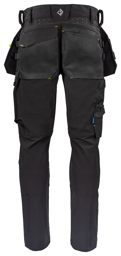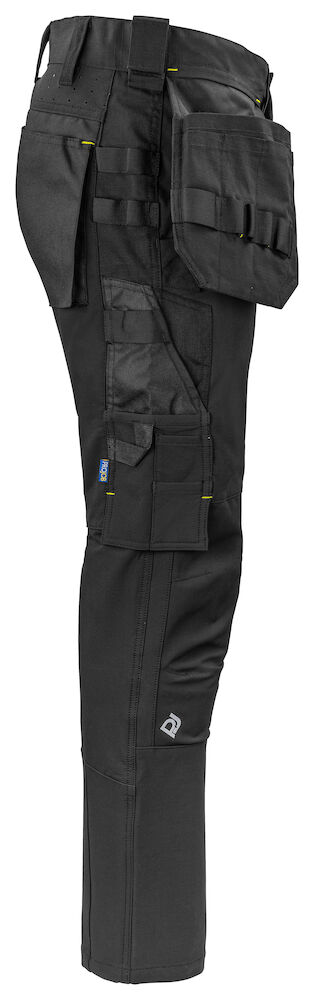 Arbejdsbuks med fuld stretch, der giver maksimal bevægelsesfrihed og komfort. Særdeles komfortabel metervare indvendigt. Moderne pasform. Lille panel i siderne øverst på buksen er ikke i stretch for at give god stabilitet. Hængelommer med ekstra rum og indvendig Cordura®-forstærkning. Ved at fjerne kontrastsømmen på bagsiden af hængelommerne kan disse fjernes let, hvis det ønskes. Ventilationsåbninger på bærestykket øverst bagpå, lige under linningen. Rummelige lårlommer på begge sider. Venstre lårlomme til værktøj og kuglepenne, samt en telefonlomme med magnetlukning og et holder til fastgørelse af ID-kort. På højre sidelomme plads til tommestok og lomme til værktøj med knivknap. Bredere bæltestrop bagpå for at forhindre tryk fra bæltet. Baglommer i Cordura®, en med klap og magnetlukning. Forbøjede knæ. Indvendige lommer til knæbeskyttere, justerbar i to højdeniveauer. Mulighed for at fastgøre MOLLE-system på begge sider. Knæ er forstærket med Cordura Stretch for optimal komfort og slidstyrke.