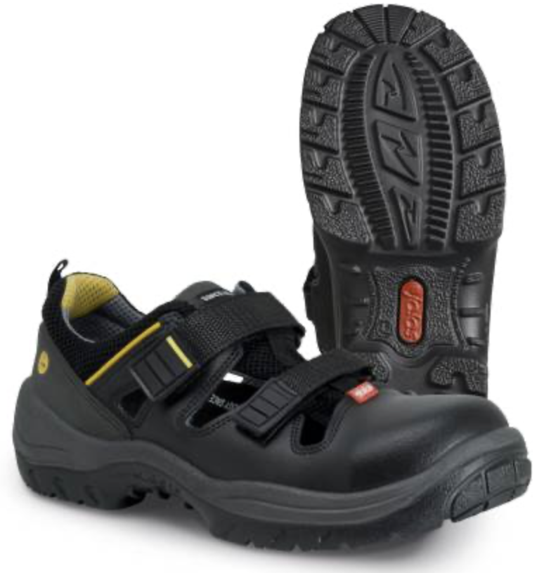 Sikkerhedssandal, tåhættemateriale aluminum, PU-mellemsål, plastikstabilisator, gummiydersål, materiale på overdel PU-behandlet læder;Spalt