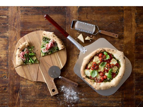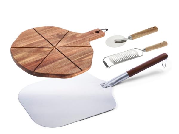 Alle fortjener at få serveret lækker, sprød pizza. Her kommer du et skridt nærmere succes i pizzakøkkenet. Gaven indeholder en stor pizzaspade i aluminium med trægreb, et flot og rustikt serveringsbræt med riller i akacietræ dia. 36 cm, pizzaskærer og groft rivejern i stål og akacietræ.