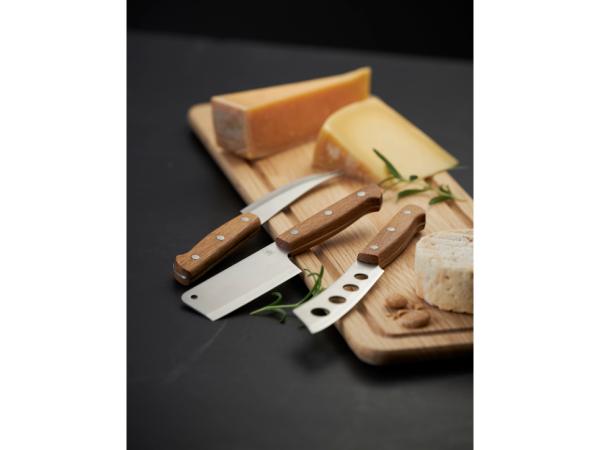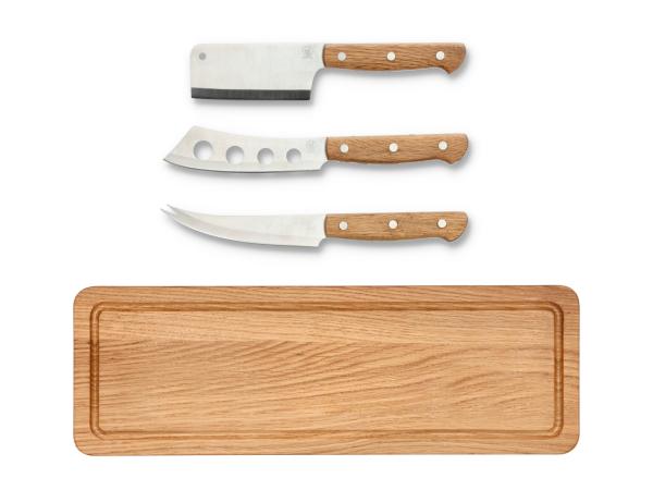 Ostesættet med tre osteknive og et stort skærebræt giver de perfekte rammer til osteanretningen. Træet er FSC-certificeret eg. Brættet måler 50 x 17 cm og har saftrille på den ene side, mens den anden side er glat. Knivbladene er udført i rustfrit kvalitetsstål og håndtagene i olieret eg, der er udformet i ét stykke og er behageligt at holde om.
