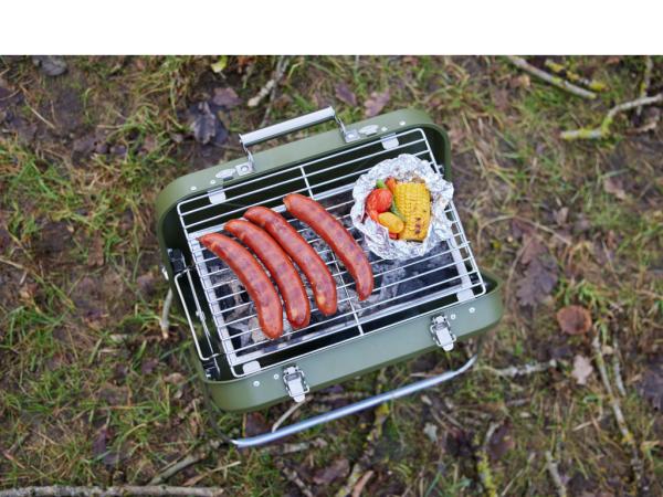 Handy kuffertgrill med grillrist, kulrist, drypbakke. 40 x 31,5 x 32 cm. Rustfrit stål, army. To go BBQ kulgrill 40 x 31,5 x 32 cm Army Stainless steel