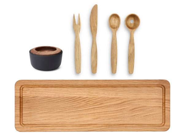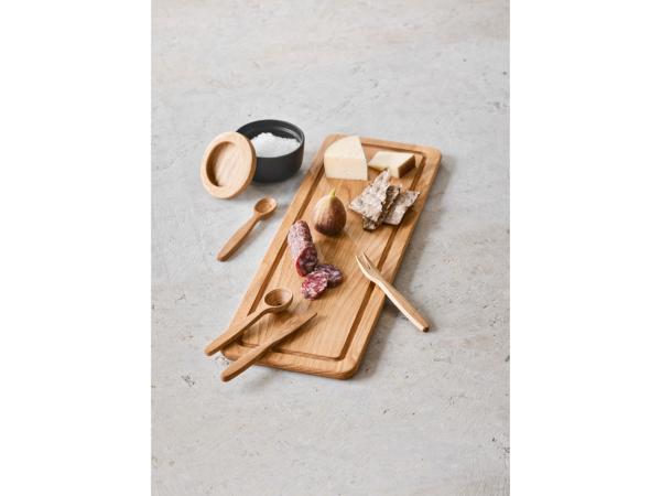 Med det stilfulde tapassæt er der lagt op til lækre hyggestunder med venner og familie. Det smukke skærebræt, 50 x 17 cm, er fremstillet af olieret eg og har mange anvendelsesmuligheder. Sættet består yderligere af en olivenske, en almindelig ske og en smart gaffel, alle 14 cm, en kniv på 16 cm samt et Kit saltkar af støbejern med egetræslåg. Dia. 10 cm, H 5 cm.
