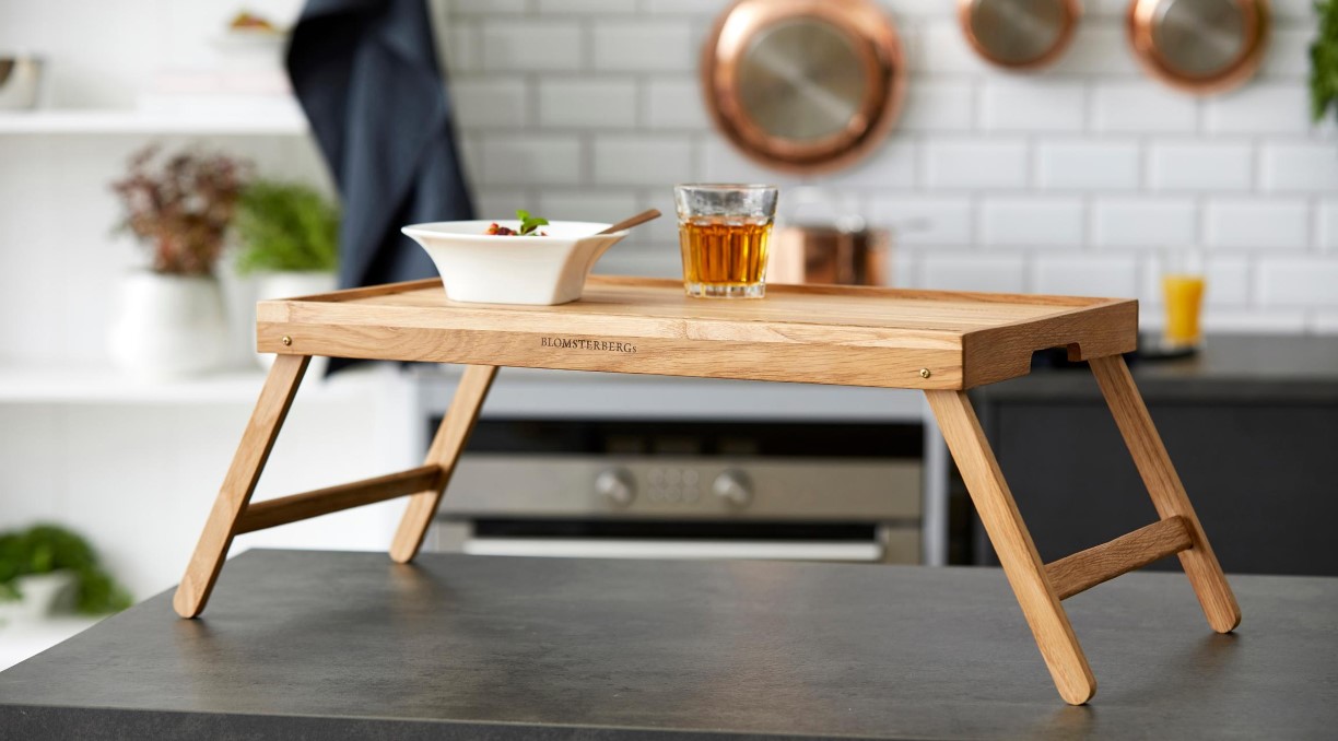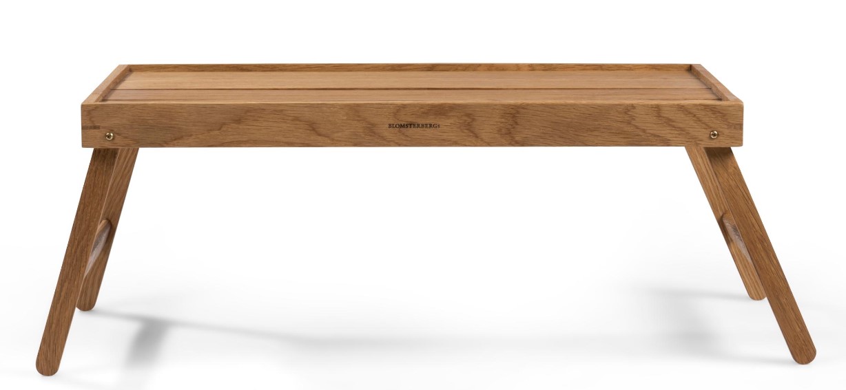 Serverings-/sengebakke med sammenklappelige ben. Server dejlig morgenmad på sengen eller nyd en afslappet stund i sofaen. Bakken aftørres med en fugtig klud og kan løbende vedligeholdes med madolie. Varen er produceret i FSC®-certificeret egetræ (FSC-C166612).
