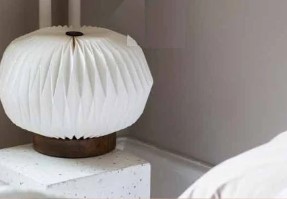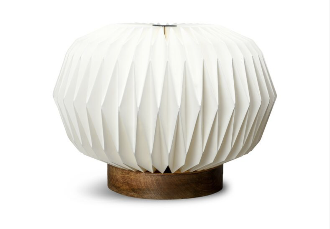 Lampen er af papir og foden er af mangotræ.