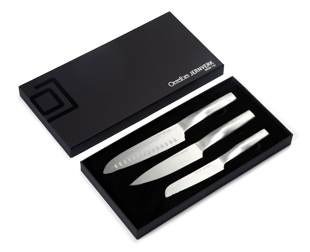 En fantastisk gave med tre knive i svensk design. Leveres i en fin gaveæske. Størrelse: Køkkenkniv 15 cm, Santoku kniv 20 cm, Tomatkniv 13 cm (bladets længde)