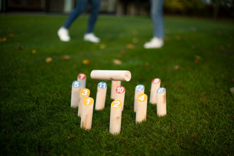 Number Kubb er rigtig god underholding til både børnog voksne. Spillet er ideelt til haven - hvor man scorerpoint afhængigt af hvor mange og hvilke pinde manvælter. Der medfølger 12 træ piller nummeret fra 1-12lavet af FSC certificeret træ. Desuden medfølger enbomulds opbevarings taske.