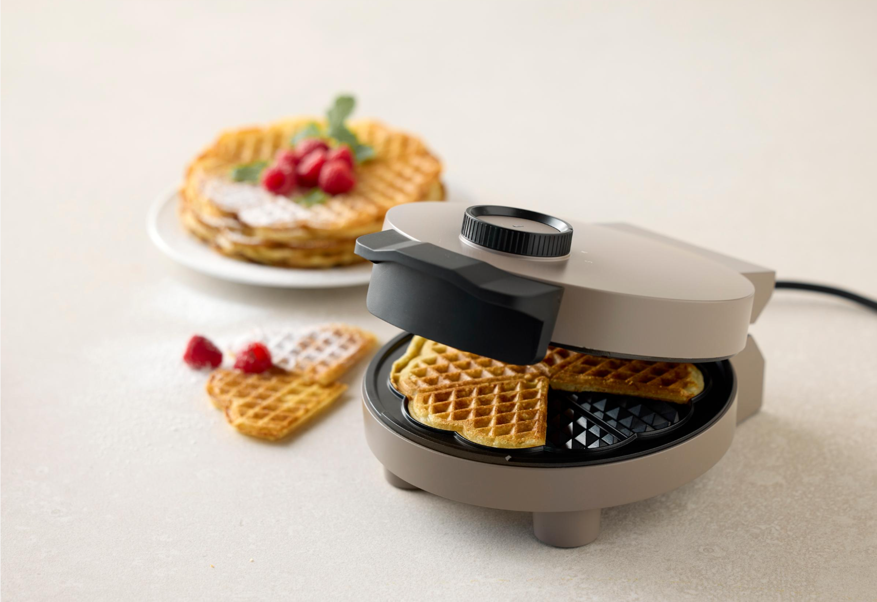 Giv morgenbordet eller eftermiddagshyggen et ekstra skud kærlighed med hjerteformede vafler, der vækker begejstring hos både store og små. Vaffeljernet har plader med en diameter på 15,5 cm og en non-stick-belægning, som får dine vafler til at slippe nemt – og belægningen er produceret uden PFAS. Med justerbar temperatur, lysindikator og en smart dampventilering, som sikrer, at hver vaffel får den helt rigtige sprødhed.