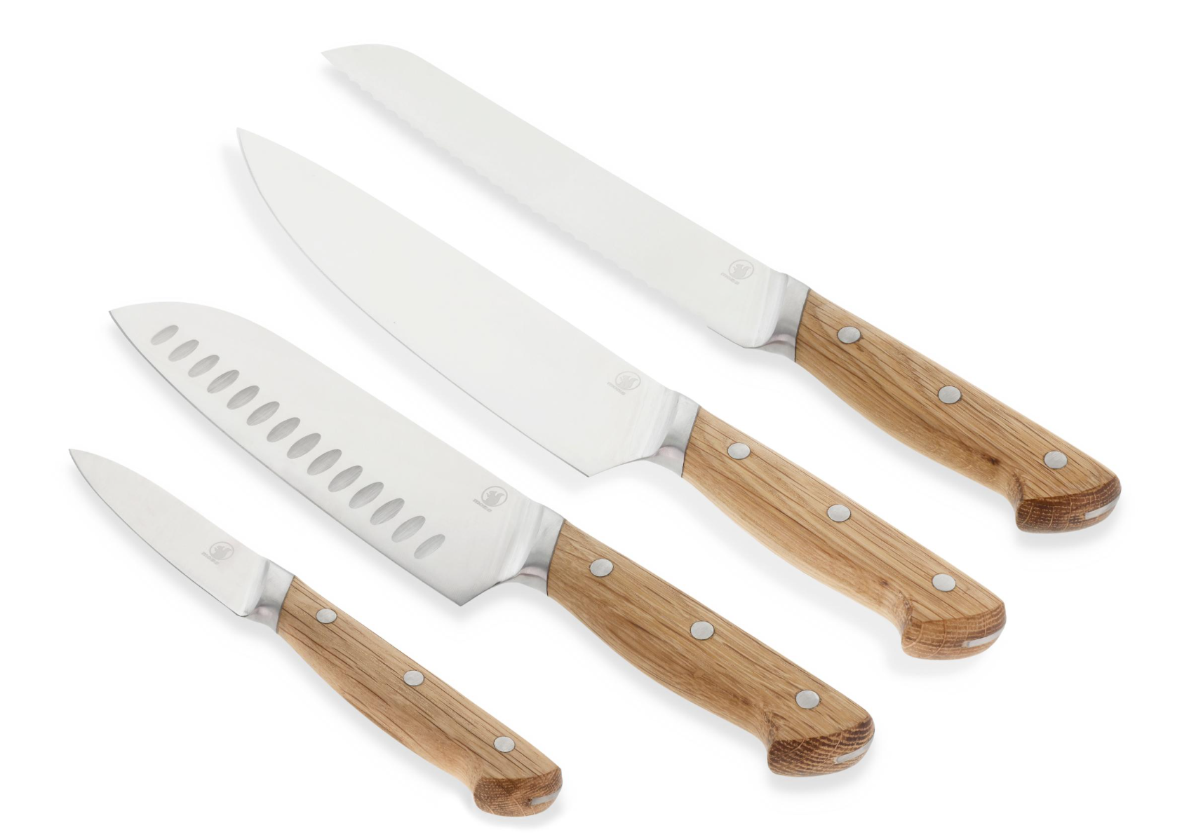 Knivsættet med kokkekniv, brødkniv, santokukniv og urtekniv er det perfekte knivsæt til køkkenet. Knivbladene er udført i rustfrit kvalitetsstål og håndtagene i olieret eg, som ved brug vil udvikle patina og blot blive smukkere, jo mere knivene bruges. Træhåndtagene er udformet af ét stykke træ og er behagelige at holde om. Santokuknivens blad er designet med luftskær, der sørger for, at det afskårne ikke sætter sig fast på bladet.