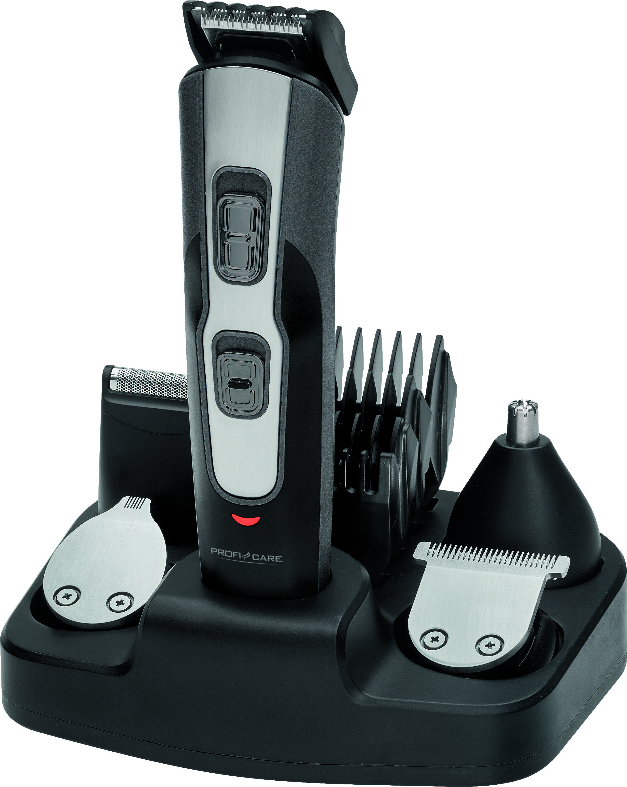 5 i 1 - Hårtrimmer, barbermaskine til mænd, skægtrimmer, præcisionstrimmer og næse-/ørehårsfjerner> Multifunktionel hårklipper til ansigts- og kropshår med indlæg af rustfrit stål i høj kvalitet> Direkte drevfunktion - med fuldt afladet batteri kan barbermaskinen bruges med det samme,når den tilsluttes lysnettet> 3-trins udtyndingsfunktion (kan skiftes)> Grundig og skånsom hårfjerning selv på følsomme områder af kroppen uden hudirritation> Drift af akkumulator/mains> Inkl. rejseopladningsadapter til 100-240 volt drift> Inkl. 5 udskiftelige hoveddele i rustfrit stål:– 1x hårklippertilbehør (39 mm bredt) med 4 kamtilbehør (3, 6, 9, 12 mm)– 1x skægklippertilbehør (30 mm bredt) med 1 kamtilbehør (2, 3, 4, 5 mm i 4 trin)– 1x barbermaskine (30 mm bred)– 1x præcisionstrimmer– 1x hårfjerner til næse/øre> Nem håndtering takket være ergonomisk udformet håndtag> Aftagelige hoveddele i rustfrit stål for nem rengøring> LED-opladningsindikator> Inkl. 8 tilbehørsdele: ladestation/stander, rejseoplader, rengøringsbørste, 5kamtilbehør> Strømforsyning (strømforsyningsenhed): 100-240 V, 50/60 Hz; genopladeligt batteri (NiMh): 2x