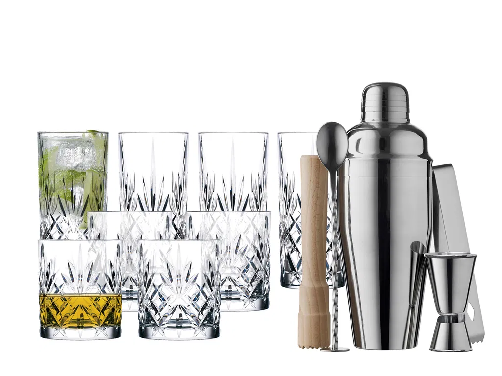 4 stk. Melodia whiskyglas, 4 stk. Melodia highballglas og et lækkert barsæt fra Funktion Bar i rustfrit stål og bøgetræ. Barsættet indeholder 700 ml shaker, 19,5 cm røreske, 2/4 cl dobbelt målebæger og istang i rustfrit stål samt 15,6 cm støder i bøgetræ. Ståldelene kan vaskes i opvaskemaskine, mens støderen skal håndopvaskes.