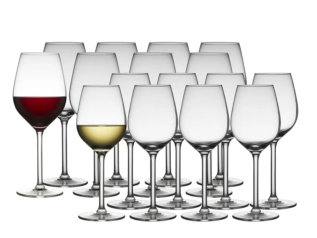 Dæk et smukt og elegant middagsbord. Sættet består af 8 rødvinsglas 50 cl og 8 hvidvinsglas 38 cl.