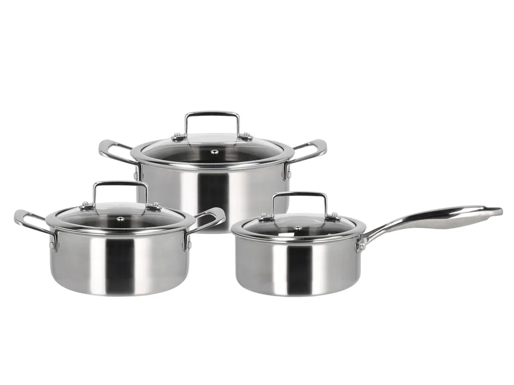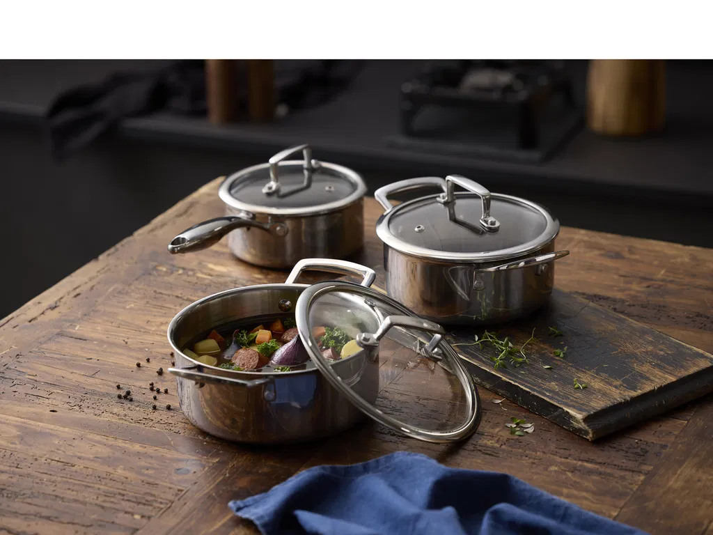 Grydesættet indeholder en kasserolle på 1,2 liter samt gryder på 2 og 2,7 liter, alle med låg. Hybrid 3ply-serien er fremstillet af rustfrit stål med keramisk hybrid-belægning, der sikrer gode stegeegenskaber og let rengøring. Bemærk, at 3-ply-konstruktionen med sin struktur af to lag rustfrit stål og et lag aluminium i midten, opvarmes meget hurtigt. Vær derfor forsigtig med ikke at overophede, men varm gryder og pander langsomt op. Det hævede mønster beskytter belægningen i bunden af gryder og pander og forlænger deres levetid, og det keramiske toplag giver en god non-stick-effekt. Produceret uden PFAS.