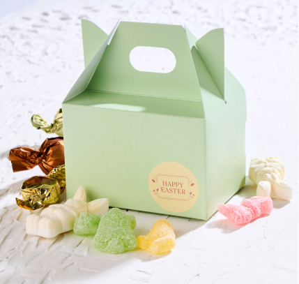 Indeni gemmer sig et nøje udvalgt påskemix af lækre chokoladeæg, guldkarameller, syrlige påskevingummier og fine skumharer – perfekt afstemt i både smag og udtryk.
