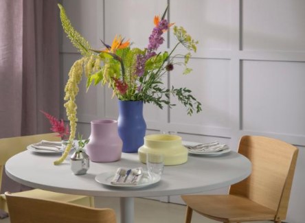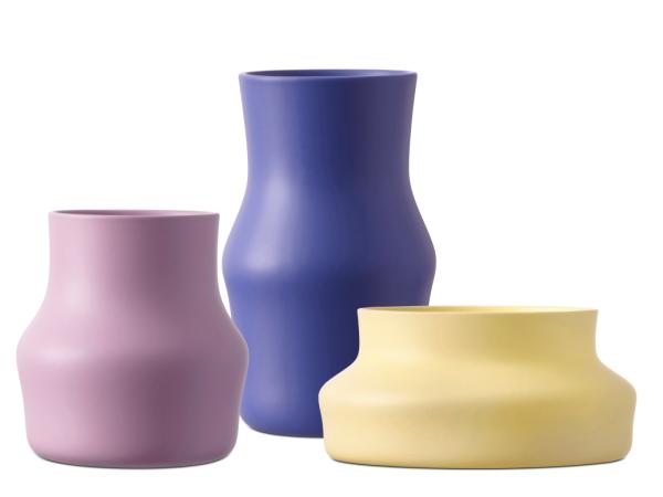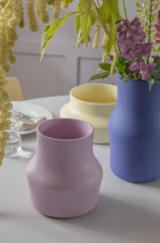 Gense Dorotea vasesæt. Tre keramikvaser i smukke farver med tydelige referencer til polarlysets blå, violette og gule nuancer. Iris blue H 28 cm, Lilac purple H 19,5 cm samt Mellow yellow H 12 cm. GAVE Gense Vasesæt Dorotea