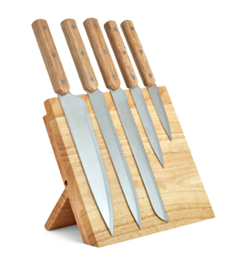 Knivsættet fra Livoo indeholder 5 forskellige knive samt en magnetisk blok til opbevaring.