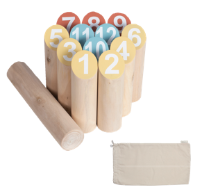 Number Kubb er rigtig god underholding til både børn og voksne. Spillet er ideelt til haven - hvor man scorer point afhængigt af hvor mange og hvilke pinde man vælter. Der medfølger 12 træ piller nummeret fra 1-12 lavetaf FSC certificeret træ. Desuden medfølger en bomulds opbevarings taske.