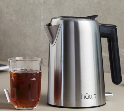 Hâws elkedel m. smartlåg teknologi. Smartlåget åbner og lukker af sig selv ved påfyldning af vand. Idet vandet rammer lågetåbner det til påfyldning og derefter lukker det selv igen. Elkedlen har en kapacitet på 1,7 L og har et 360 graders ledningsfrit design.Produktet slukker automatisk for beskyttelse imod tørkogning. Tænd/sluk knappen er oplyst.