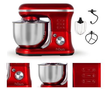 Hâws køkkenmaskine i elegant rødt design er en maskine med flere funktioner med en høj ydeevne med 1200W. Produktet kanbåde røre, piske og ælte alt efter hvad ud ønsker at lave. Ingredienser kan blandes med 6 forskellige hastigheder hvilket gørdenne køkkenmaskine særdeles effektiv da den i løbet af kort tid kan forarbejde de ønsket ingredienser. Køkkenmaskinen erdesignet således den er ekstra brugervenlig da hastigheden kan indstilles individuelt. Derudover behøves skålen ikke at fjernes imensden er i gang da plastlåget er designet med et hul. På den måde kan der nemt tilføjes ekstra ingredienser imens produktet kører.
