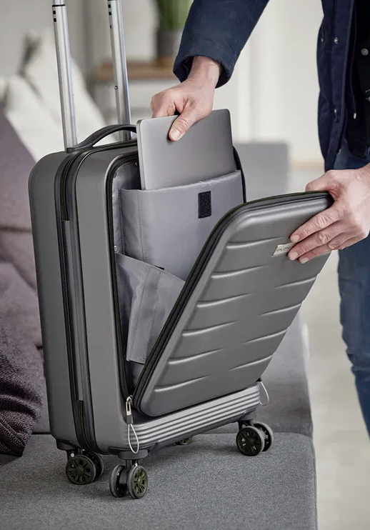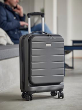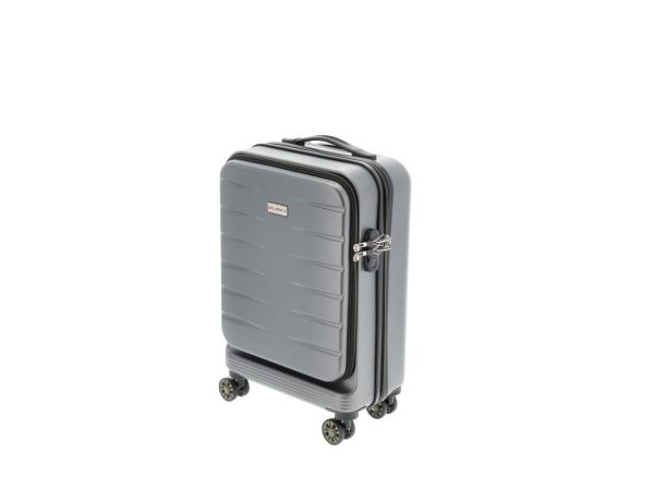 Kabinekuffert med frontlomme til laptop, fremstillet i gråbrun ABS med flot grøn kontrast ved lynlås og på hjul, med lås til begge rum. Ruller ubesværet på 360 grader dobbelthjul. 35 x 21 x 56 cm.