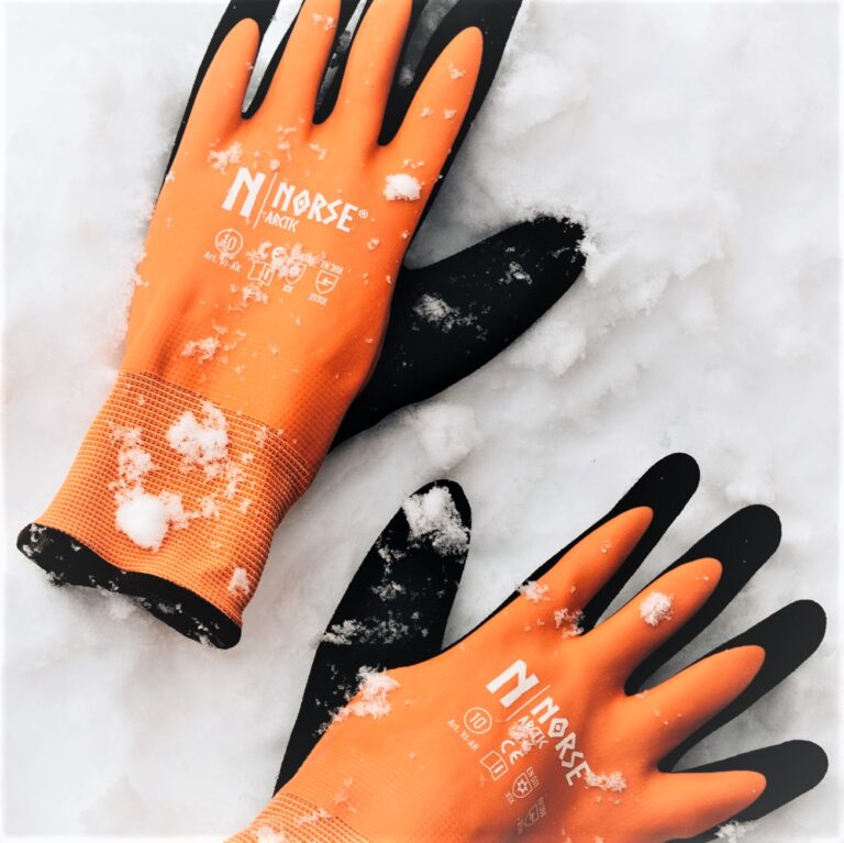 NORSE Arctic er en høj-kvalitets foret fleksibel vandtæt montagehandske. Opbygningen er en foret strikhandske der er dyppet i naturgummi, og dermed gør den helt vand og vindtæt. Dertil har håndfladen fået en overflade af opskummet naturgummi og giver handsken en god solid gribe flade, så materialer ikke glider ud af hænder og fingre. Norse Arctic sørger for at holde hænder og fingre tørre og varme, selv i meget kolde miljøer.