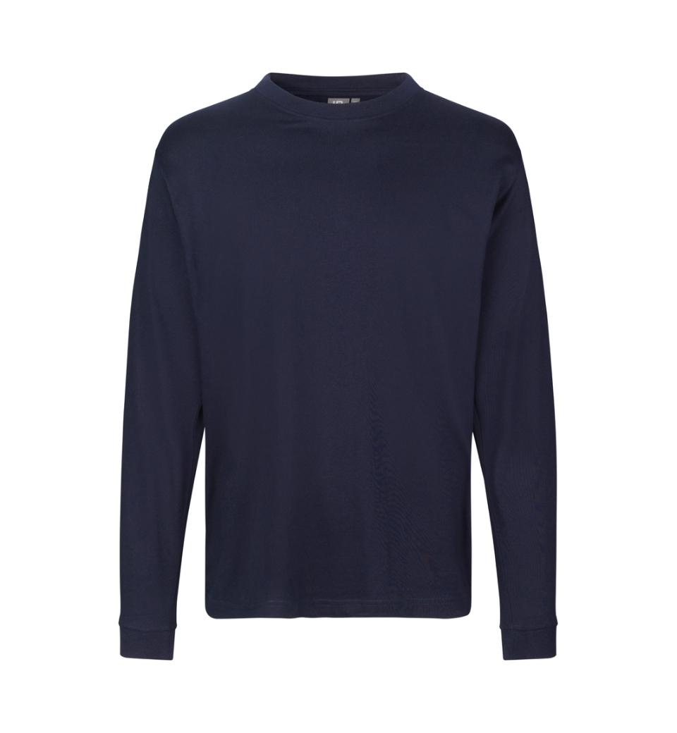 Ekstra slidstærk T-shirt med lange ærmer. Fire-lags halsrib, nakke- og skulderbånd og nakkespejl. T-shirten har gennemgået en forkrympningsproces ved meget høje temperaturer, både før og efter indfarvningen, for ekstra stabilitet og lang levetid. Ribafslutning ved ærme.