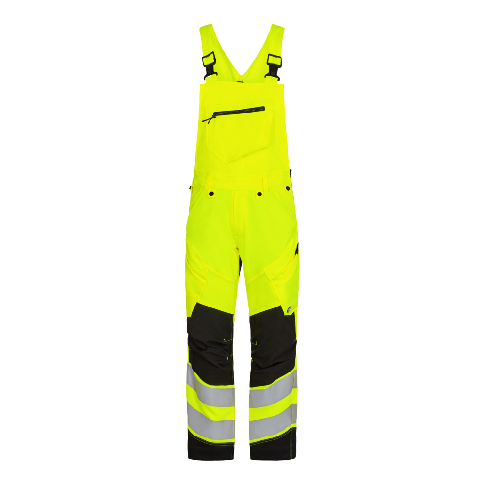 Strækbar og funktionel fluorescerende overall i moderne snit. Den strækbare metervare gør at bevægelighed og komfort er i top. Optimal pasform med bl.a. ergonomisk formet knæparti. Høj ryg og ribpaneler i siderne for optimal pasform og komfort. Regulerbare seler. Smæklomme med lynlås. Indvendig lomme med lynlås i smæk. To baglommer. To lårlommer som lukkes med lynlås. I venstre side har lårlommen en ekstra telefonlomme. I højre side har lårlommen påmonteret forstærket tommestoklomme med inddelinger. D-ring skjult i smæklomme til påsætning af f.eks. ID-kort. Knæforstærkning/Knælomme i CORDURA® materiale med velcrolukning forneden. Bukserne har en ekstra bred oplægning, der er beregnet til at øge længden på bukserne, hvis der er brug for ekstra benlængde. En enkelt søm pilles op, og derefter er bukserne med ekstra benlængde - og stadig sømmet op. Beklædningsklasse 2. Testet efter 50 vaske.