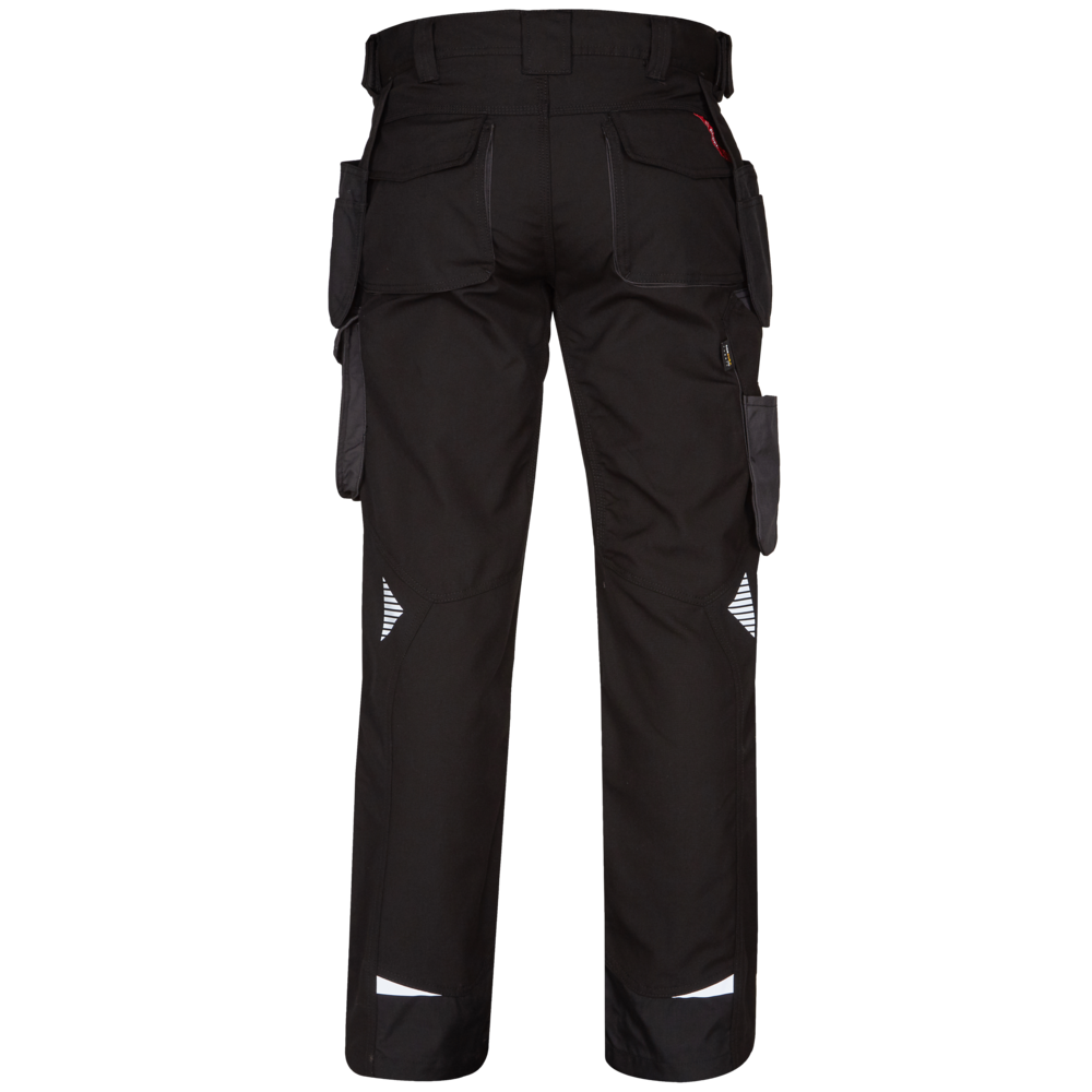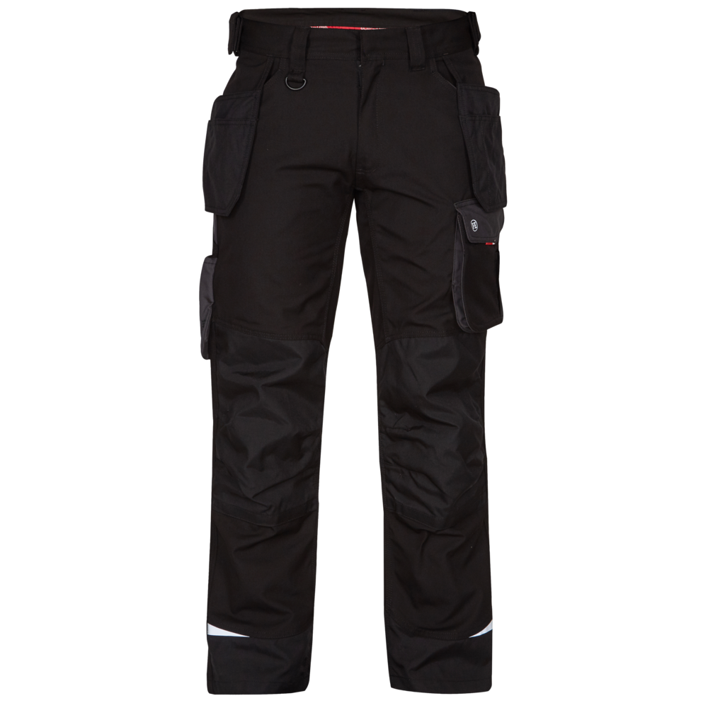 Funktionel arbejdsbuks med mange detaljer. Optimal pasform med bl.a. ergonomisk formet knæparti og panel i indersøm, der giver en behagelig skridtsøm. To rummelige skrålommer samt hængelommer foran. Strop med D-ring til fæstning af f.eks. ID-kort foran. To rummelige baglommer med klap og velcrolukning. Lårlomme med lynlåslomme til f.eks. mobiltelefon samt ekstra mindre lomme. Lårlommen har box-effekt, hvilket gør den meget rummelig og endvidere har den løsthængende bund for øget bevægelighed. Tommestoklomme med ekstra inddelinger og forstærket bund. Også tommestoklommen har frithængende bund for øget bevægelighed. Knæforstærkning/knælomme med velcrolukning forneden samt to indstillingsmuligheder til knæpude. Forstærkning i bunden af buksebenene både bagpå og foran for ekstra slidstyrke. Reflekser ved knæ og nederst på buksebenene for øget synlighed. Egnet til industrivask.