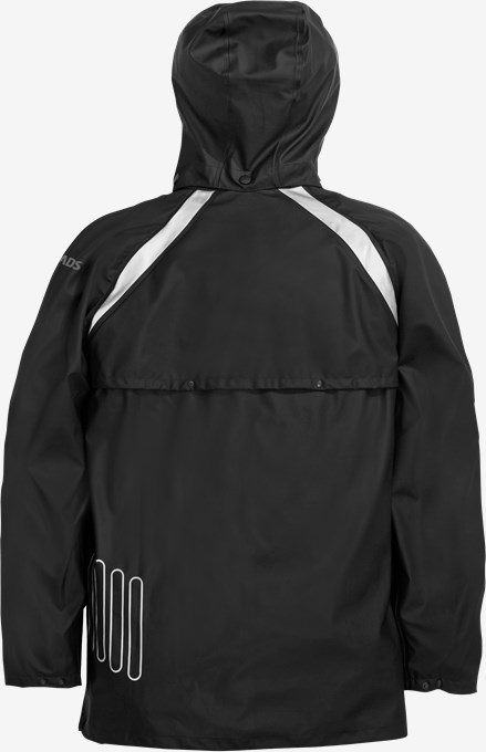 Regnjakke i stretchmateriale med aftagelig hætte og ventilation for og bag.