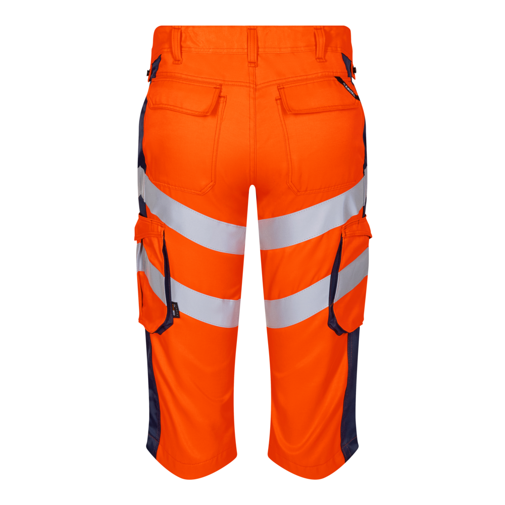 Funktionelle fluorescerende knickers med moderne snit. Metervaren er slidstærk og åndbar og lavet af 50% re-genereret polyester. Elastik i taljen bagpå sikrer god pasform og gør, at knickersen bliver, hvor den skal ved bevægelse. D-ring foran til påsætning af f.eks. ID-kort. To rummelige skrålommer foran. To baglommer med klap og lukket med velcro. To lårlommer som lukkes med velcro, I venstre side har lårlommen en ekstra telefonlomme samt indvendig lomme til bl.a. walkie talkie. I højre side er der en indvendig lomme til opbevaring af f.eks. tommestok. Knæforstærkning/Knælomme i CORDURA® materiale med velcrolukning forneden. Reflekser om låret. Beklædningsklasse 1. Testet efter 50 vaske.