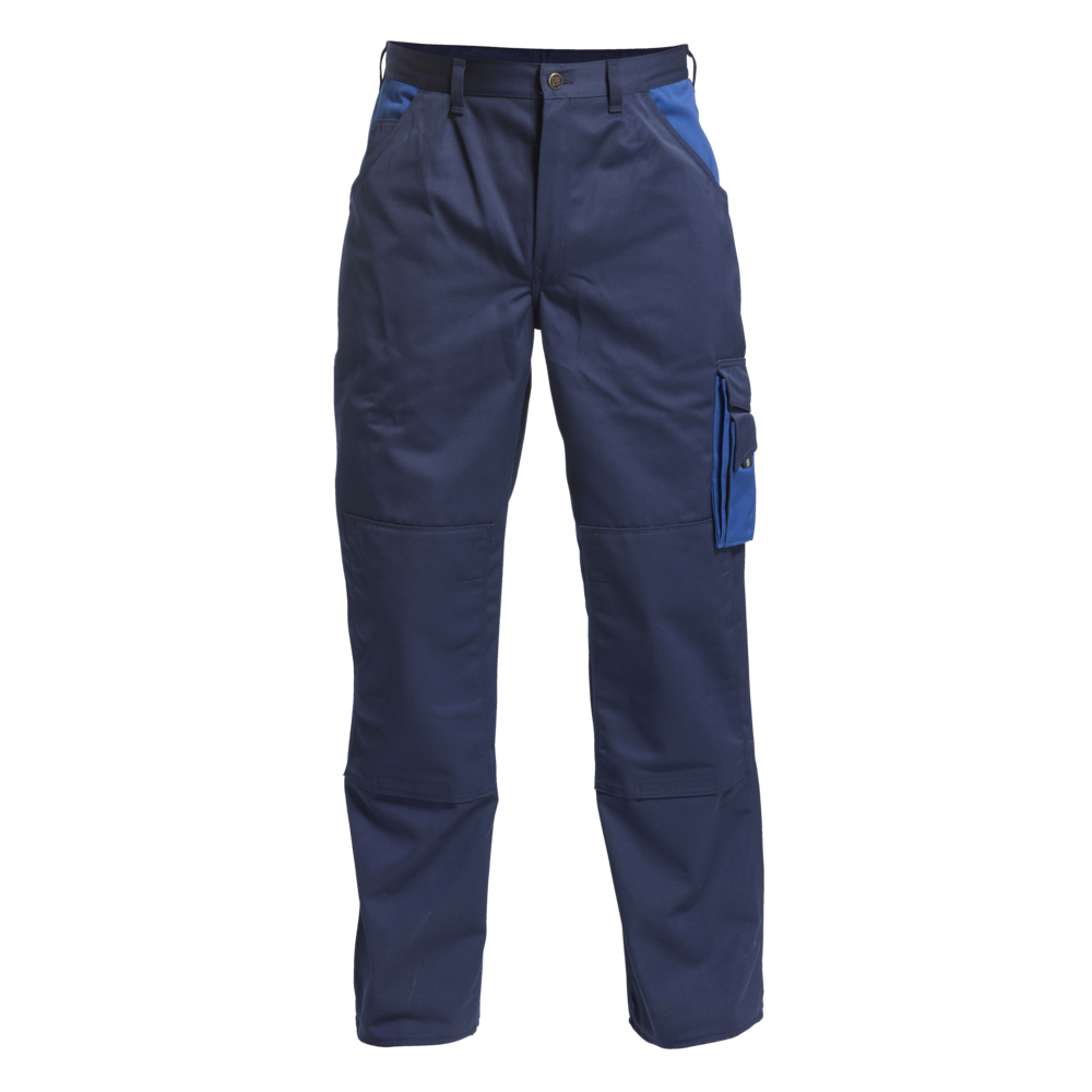 Tofarvet buks i flot design. To sidelommer, den ene med møntlomme. To baglommer. Rummelig lårlomme med mobiltelefonlomme og blyantlommer. Hammerstrop. Forstærket tommestoklomme med læg for ekstra plads. Knæforstærkning/knælomme med velcrolukning i bunden samt indstillingsmuligheder til knæpude. Egnet til industrivask.