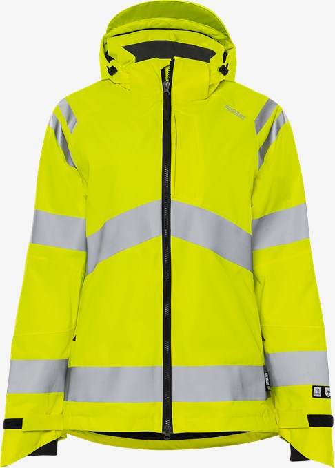 Skaljakke med høj synlighed til damer fremstillet i blødt og fleksibelt genbrugsmateriale. Vandtæt, vindtæt og åndbart arbejdstøjsjakke med tapede sømme. Komfortabelt tøj året rundt, der kan kombineres med et isolerende mellemlag, når det er koldt. Koncept: Trofta