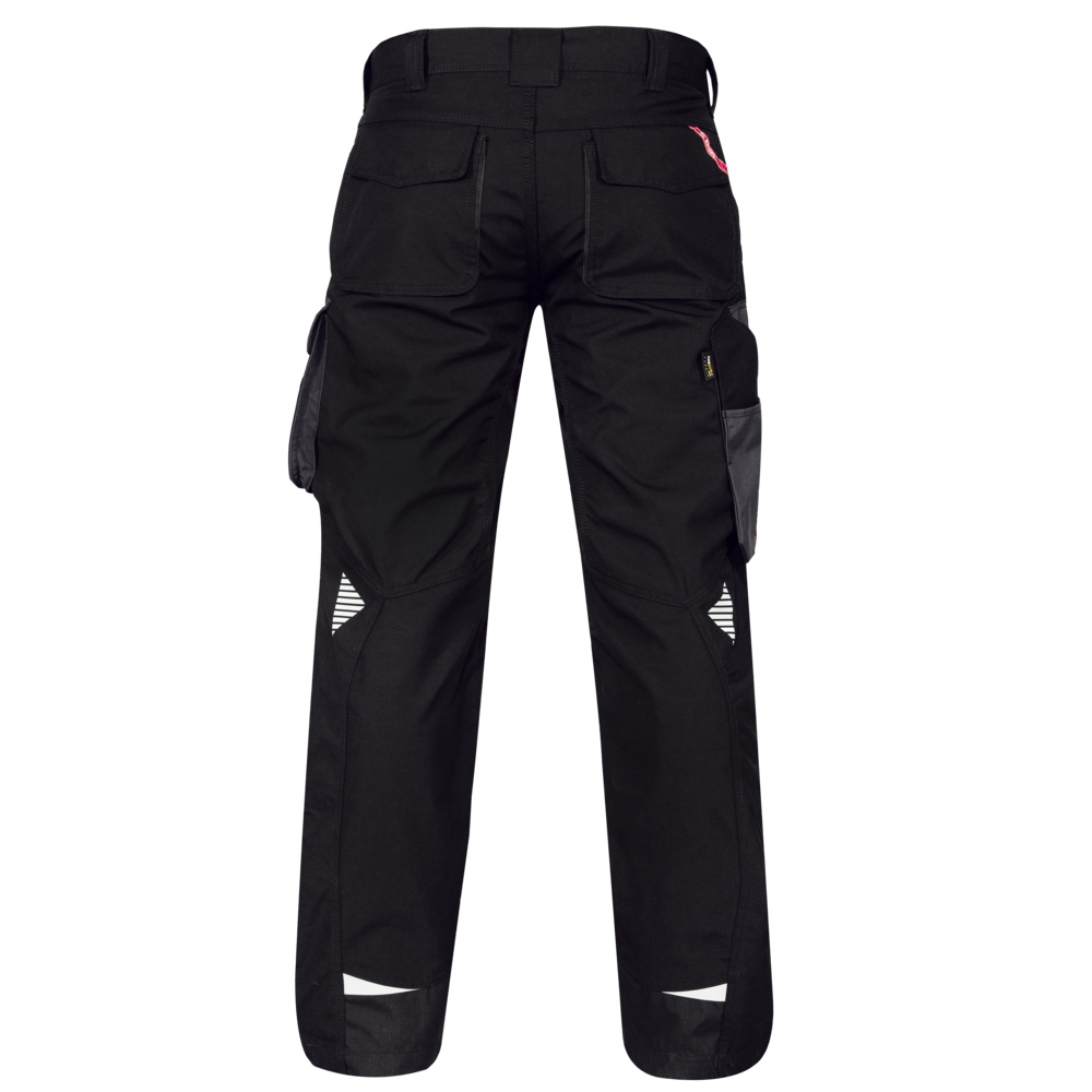 Funktionel arbejdsbuks med mange detaljer. Optimal pasform med bl.a. ergonomisk formet knæparti og panel i indersøm, der giver en behagelig skridtsøm. To rummelige skrålommer foran. Strop med D-ring til fæstning af f.eks. ID-kort foran. To rummelige baglommer med klap og velcrolukning. Lårlomme med lynlåslomme til f.eks. mobiltelefon samt ekstra mindre lomme. Lårlommen har box-effekt, hvilket gør den meget rummelig og endvidere har den løsthængende bund for øget bevægelighed. Tommestoklomme med ekstra inddelinger og forstærket bund. Også tommestoklommen har frithængende bund for øget bevægelighed. Knæforstærkning/knælomme med velcrolukning forneden samt to indstillingsmuligheder til knæpude. Forstærkning i bunden af buksebenene både bagpå og foran for ekstra slidstyrke. Reflekser ved knæ og nederst på buksebenene for øget synlighed. Egnet til industrivask.