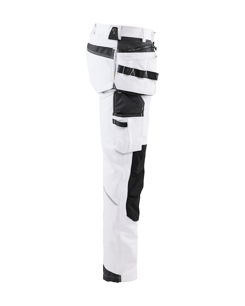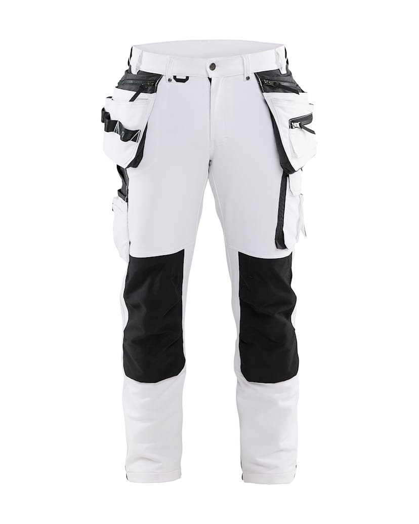 Materialet er et glat 4-vejs stretch materiale, der er stærkt og fleksibelt i alle retninger. Bukserne har avancerede detaljer og specialdesignede lommer til børster, kniv og spartel samt sømlommer. Knælommerne er forstærket med CORDURA® stretch materiale på ydersiden og stretch materiale på indersiden for øget bevægelsesfrihed.