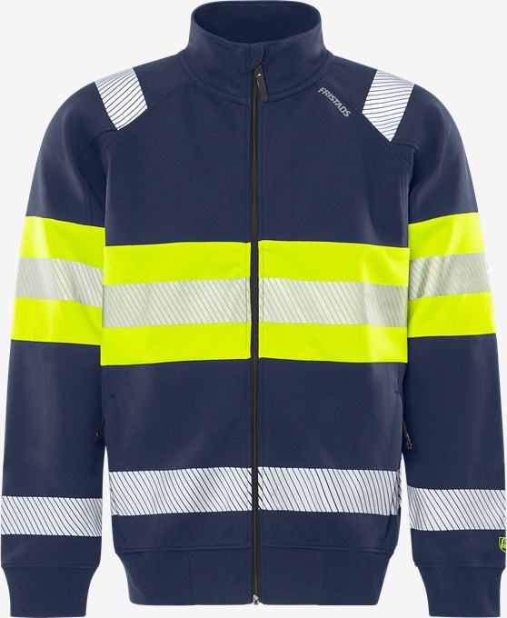 High vis sweatshirt fremstillet af økologisk bomuld i et flot dobbeltsidet stretchmateriale med lynlås i fuld længde. Denne sweatjakke i blød elastisk bomuld sikrer fremragende komfort og bevægelsesfrihed. De fluorescerende dele er fremstillet af genanvendt polyester. Koncept: Stiby