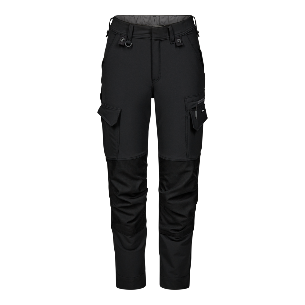 Disse arbejdsbukser til kvinder er designet med fokus på funktionalitet, slidstyrke og komfort for at opfylde behovene i krævende arbejdsmiljøer. De er fremstillet i et behageligt 4-vejsstrækmateriale, der giver øget fleksibilitet, mens Ripstop-stoffet i kontrastfarven sikrer slidstyrke og et moderne udtryk. En skjult knaplukning beskytter overflader mod ridser, og elastikken i taljen bagpå sikrer en optimal pasform, selv under bevægelse. Bukserne har knælommer med CORDURA®-forstærkning og velcrolukning samt to indstillingsmuligheder for højderegulering af knæpuderne, så de kan tilpasses individuelt. Der er mange funktionelle lommer til ekstra opbevaring, herunder en lårlomme med lynlås og en dedikeret mobiltelefonlomme på venstre lår. Forstærket tommestoklomme og hammerstrop gør det nemt at opbevare værktøj. Ligeledes er der påsatte knapper til hurtig montering af hængelommer. En praktisk strop med D-ring gør det muligt at fastgøre f.eks. ID-kort sikkert og nemt. Bukserne har desuden en ekstra bred oplægning, som muliggør forlængelse af benlængden med op til 6 cm, eller 4 cm ved kort skridtlængde, så de kan tilpasses forskellige behov. Refleksprint bag på knæene øger synligheden, specielt i mørkere omgivelser. Hovedmaterialet er indfarvet med en dope dyed-proces.