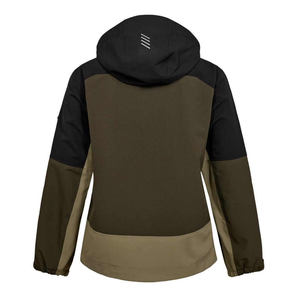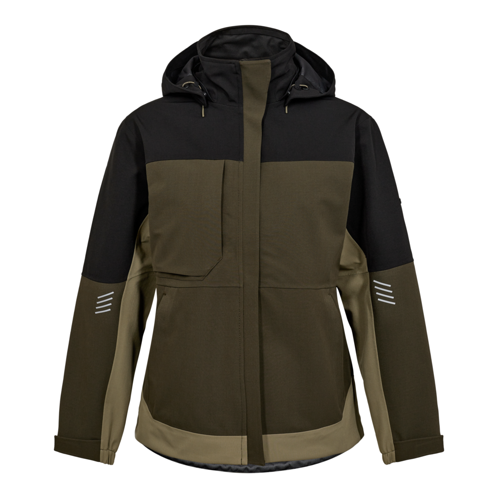 Denne skaljakke til damer er designet med fokus på funktionalitet og komfort. Den er fremstillet i Ripstop med mekanisk stretch for øget bevægelighed. Jakken er både vand- og vindtæt og har tapede sømme for ekstra beskyttelse. For øget komfort har jakken en blød og vindbeskyttende inderkrave. Den praktiske og aftagelige hætte gør jakken yderst anvendelig i mange forskellige arbejdssituationer. Jakken har desuden skjult lynlås foran med en smal stolpelukning som beskytter mod ridser. De mange praktiske lommer giver sikker opbevaring, herunder en rummelig brystlomme og to sidelommer med lynlås samt en praktisk inderlomme med velcrolukning. En D-ring i højre sidelomme gør det nemt f.eks. at fastgøre f.eks. ID-kort. For at sikre en perfekt pasform har jakken elastik og velcrojustering nederst ved ærmerne, så den kan tilpasses individuelt. Refleksprint på ærmerne og ryggen øger synligheden i mørke omgivelser, mens det forlængede bagstykke yder ekstra beskyttelse af lænden. Der er ligeledes god plads til firmaprofilering.