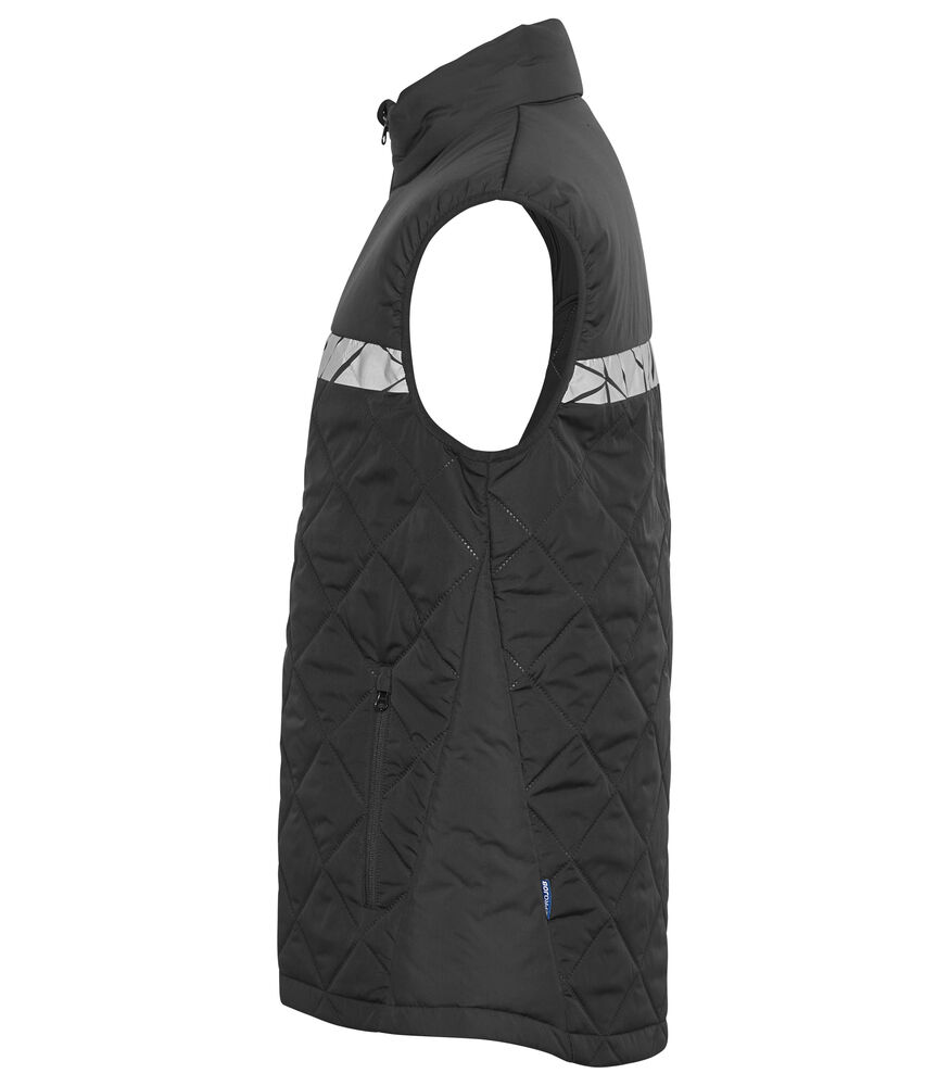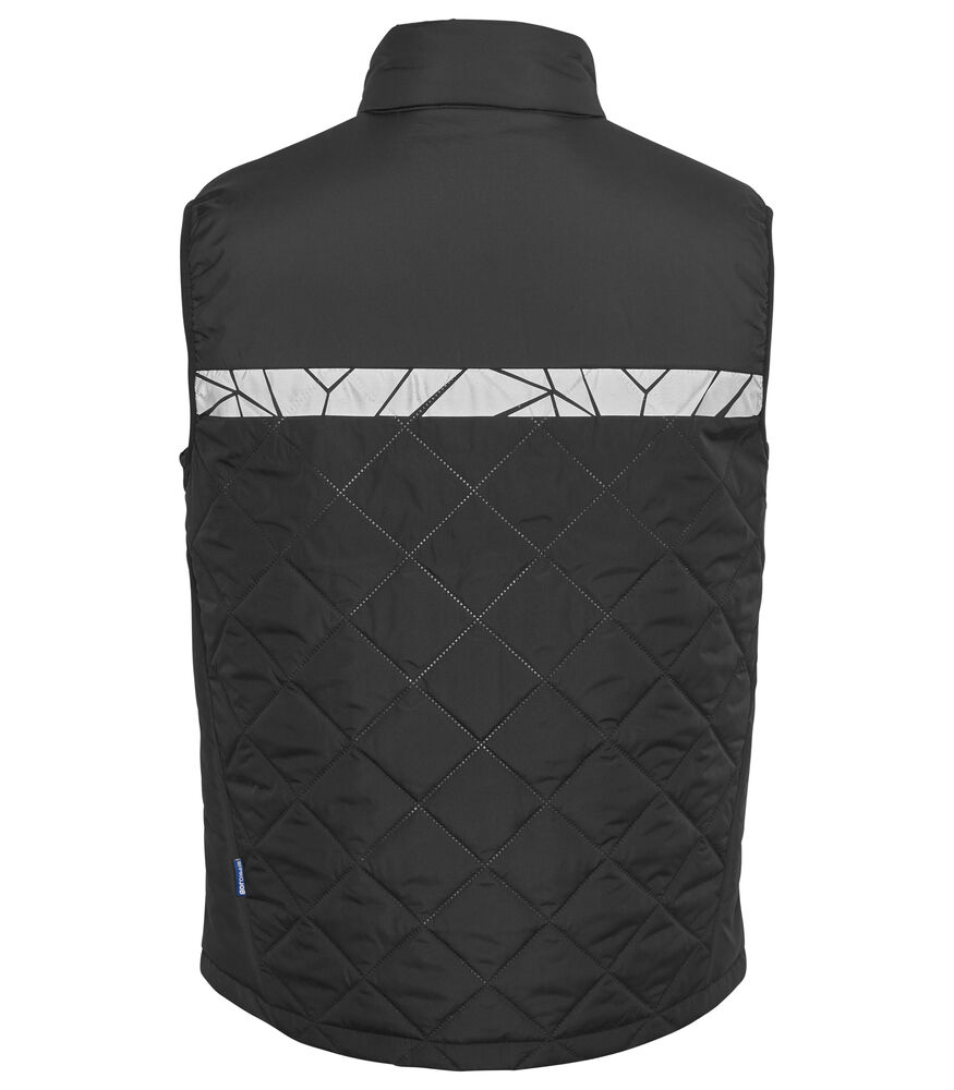 Vest i et let, sømløst diamant-quiltet stof. Brystlomme på højre side med lynlås, også en indvendig holder til fastgørelse af ID-kort. Sidelommer på begge sider med lynlås. Lomme til vaskemærkechip i den indvendige venstre sidesøm. Leveres i en biobaseret, komposterbar pose.