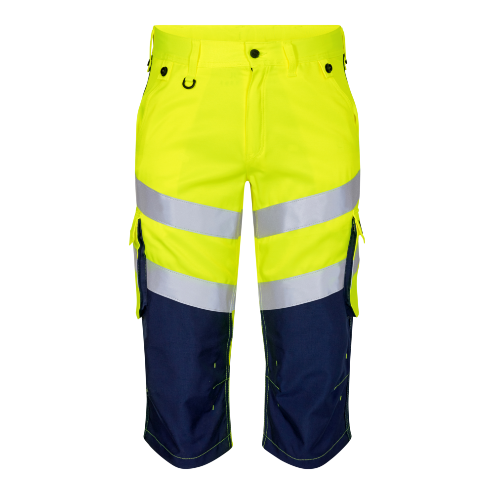 Funktionelle fluorescerende knickers med moderne snit. Metervaren er slidstærk og åndbar og lavet af 50% re-genereret polyester. Elastik i taljen bagpå sikrer god pasform og gør, at knickersen bliver, hvor den skal ved bevægelse. Knapper for let og hurtig montering af hængelommer. D-ring foran til påsætning af f.eks. ID-kort. To rummelige skrålommer foran. To baglommer med klap og lukket med velcro. To lårlommer som lukkes med velcro, I venstre side har lårlommen en ekstra telefonlomme samt indvendig lomme til bl.a. walkie talkie. I højre side er der en indvendig lomme til opbevaring af f.eks. tommestok. Knæforstærkning/Knælomme i CORDURA® materiale med velcrolukning forneden. Reflekser om låret. Beklædningsklasse 1. Testet efter 50 vaske.