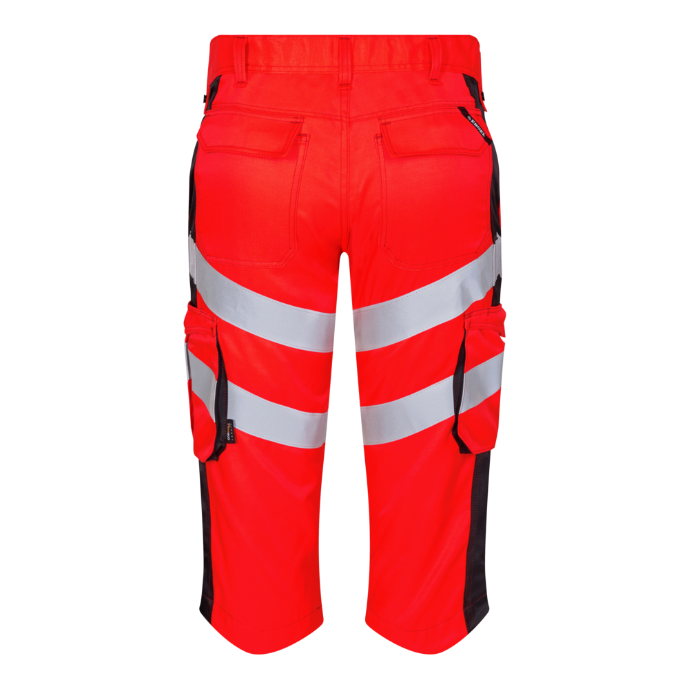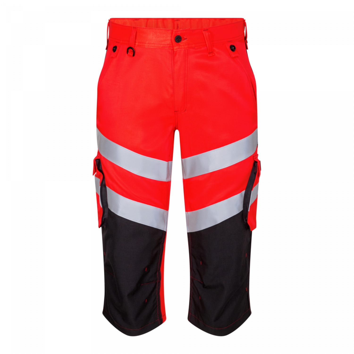 Funktionelle fluorescerende knickers med moderne snit. Metervaren er slidstærk og åndbar og lavet af 50% re-genereret polyester. Elastik i taljen bagpå sikrer god pasform og gør, at knickersen bliver, hvor den skal ved bevægelse. Knapper for let og hurtig montering af hængelommer. D-ring foran til påsætning af f.eks. ID-kort. To rummelige skrålommer foran. To baglommer med klap og lukket med velcro. To lårlommer som lukkes med velcro, I venstre side har lårlommen en ekstra telefonlomme samt indvendig lomme til bl.a. walkie talkie. I højre side er der en indvendig lomme til opbevaring af f.eks. tommestok. Knæforstærkning/Knælomme i CORDURA® materiale med velcrolukning forneden. Reflekser om låret. Beklædningsklasse 1. Testet efter 50 vaske.