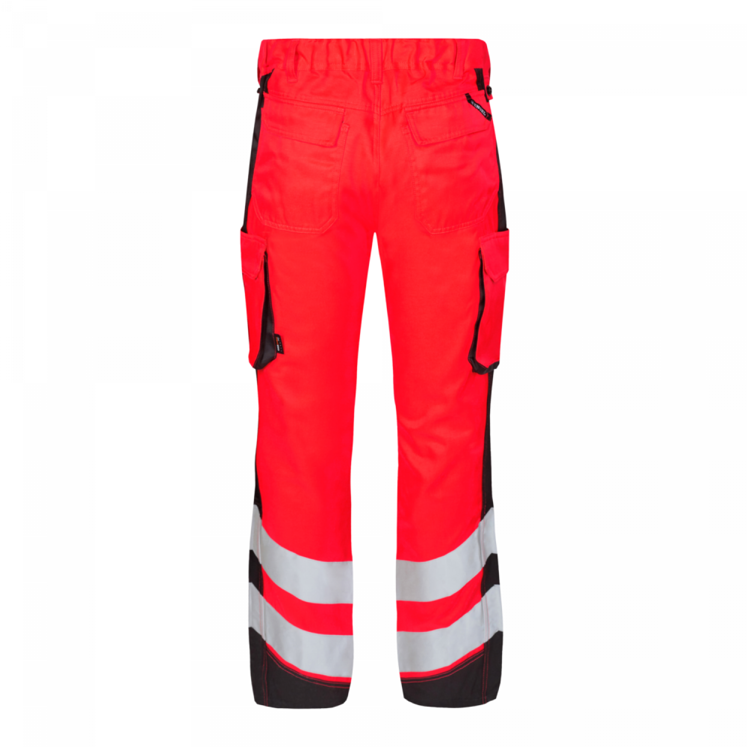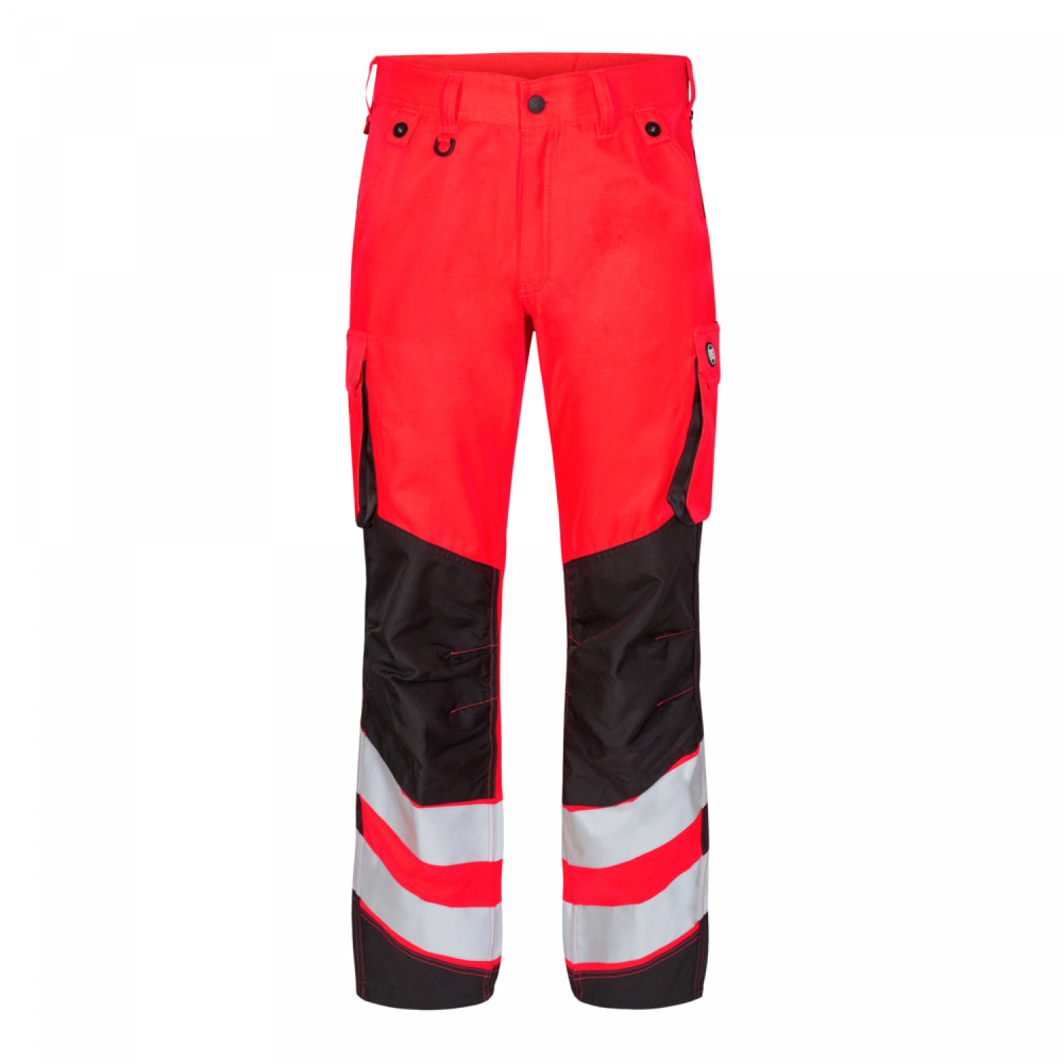 Funktionelle fluorescerende bukser med moderne snit. Optimal pasform med bl.a. ergonomisk formet knæparti. Metervaren er slidstærk og åndbar og lavet af 50% re-genereret polyester. Elastik i taljen bagpå sikrer god pasform og gør, at buksen bliver hvor den skal ved bevægelse. Knapper for let og hurtig montering af hængelommer. D-ring foran til påsætning af f.eks. ID-kort. To rummelige skrålommer foran. To baglommer med klap og lukket med velcro. To lårlommer som lukkes med velcro. I venstre side har lårlommen en ekstra telefonlomme samt indvendig lomme til bl.a. walkie talkie. I højre side er der en indvendig lomme til opbevaring af f.eks. tommestok. Knæforstærkning/Knælomme i CORDURA® materiale med velcrolukning forneden. Reflekser om underbenet. Beklædningsklasse 2. Testet efter 50 vaske.