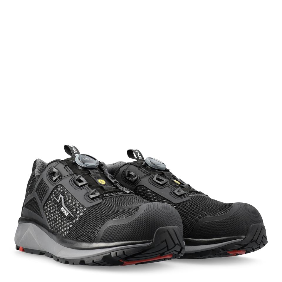 Smart og let sikkerhedssko certificeret efter de nye standarder i 2022. Overdelen består af strikket, åndbar polyester med elementer i KPU for ekstra stabilitet og styrke. At overdelen er strikket, giver en fleksibel pasform og reducerer spild i produktionen. 903 Phoenix er endda behandlet med en coating for en vandafvisende effekt. Skoen spændes og løsnes med det innovative BOA® Fit System, som giver et perfekt fit. ProNosen af KPU, et slidstærkt materiale, er godkendt efter 2022-standarden og anbefales til knælende arbejde. Gummi-ydersålen er skridhæmmende, og kombineret med en blød, stødabsorberende mellemsål i EVA giver det en komfortable og fleksibel sko. Sålen består også af en gelenk, der giver skoen stabilitet samt mindsker vrid og belastninger på hælen. Sålmønstret er designet med store knopper og brede riller, så jord, sand, vand og mudder nemt kan løbe derfra og give godt fodfæste. Indlægssålen er stødabsorberende, blød, fleksibel og åndbar og består bl.a. af upcycled PU-skum, der er skumrester fra indlægssålsproduktion. ESD-godkendt og PVC-fri. Med BOA® Fit System; ESD-godkendt; KPU ProNose; Vandafvisende coating;