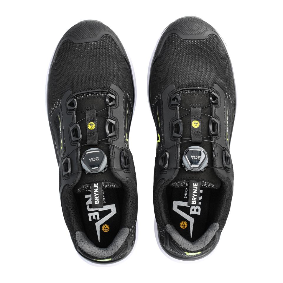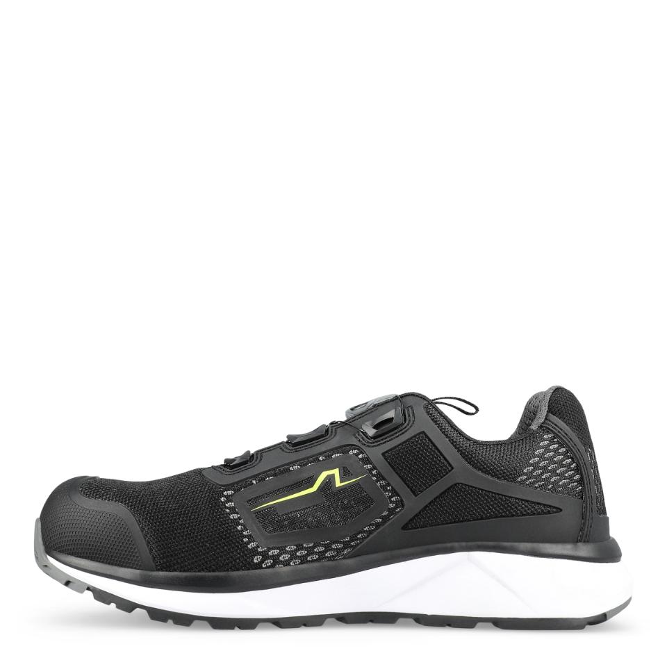 Smart, let og luftig sikkerhedssko certificeret efter de nye standarder i 2022. Overdelen består af strikket, åndbar polyester med elementer i KPU for ekstra stabilitet og styrke. At overdelen er strikket, giver en fleksibel pasform og reducerer spild i produktionen. Et åbent panel på hver side af skoen er dækket af et tyndt net, så der kommer luft ind til fødderne. Det giver samme fornemmelse som ved en sikkerhedssandal, men uden at der kommer sten, grus og byggematerialer ind til fødderne. Skoen spændes og løsnes med det innovative BOA® Fit System, som giver et perfekt fit. ProNosen af KPU, et slidstærkt materiale, er godkendt efter 2022-standarden og anbefales til knælende arbejde. Gummi-ydersålen er skridhæmmende, og kombineret med en blød, stødabsorberende mellemsål i EVA giver det en komfortable og fleksibel sko. Sålen består også af en gelenk, der giver skoen stabilitet samt mindsker vrid og belastninger på hælen. Sålmønstret er designet med store knopper og brede riller, så jord, sand, vand og mudder nemt kan løbe derfra og give godt fodfæste. Indlægssålen er stødabsorberende, blød, fleksibel og åndbar og består bl.a. af upcycled PU-skum, der er skumrester fra indlægssålsproduktion. ESD-godkendt og PVC-fri.